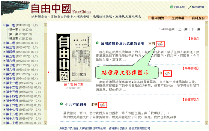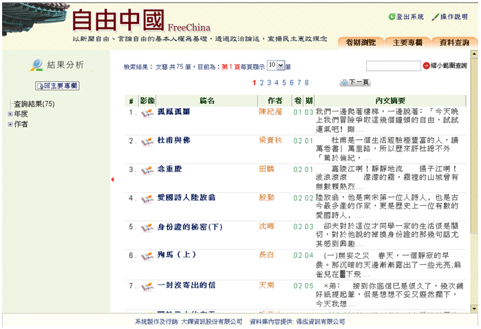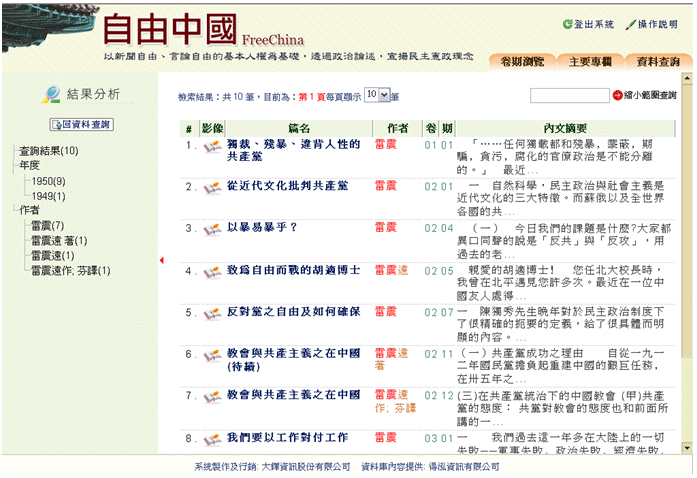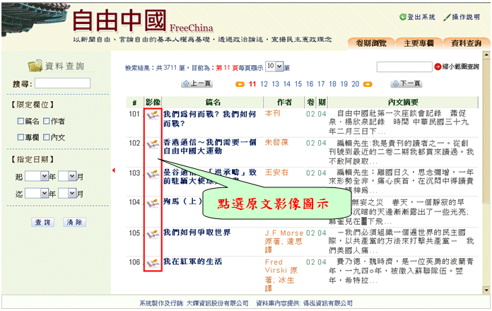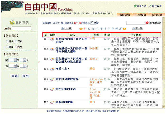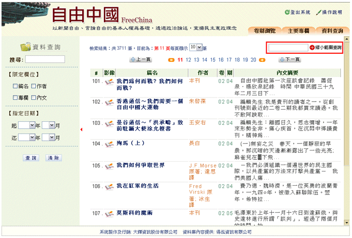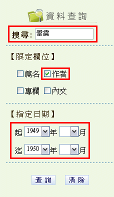 | 提供使用者輸入詞彙查詢,並同時可使用關鍵字、限定欄位、指定日期做查詢。 |